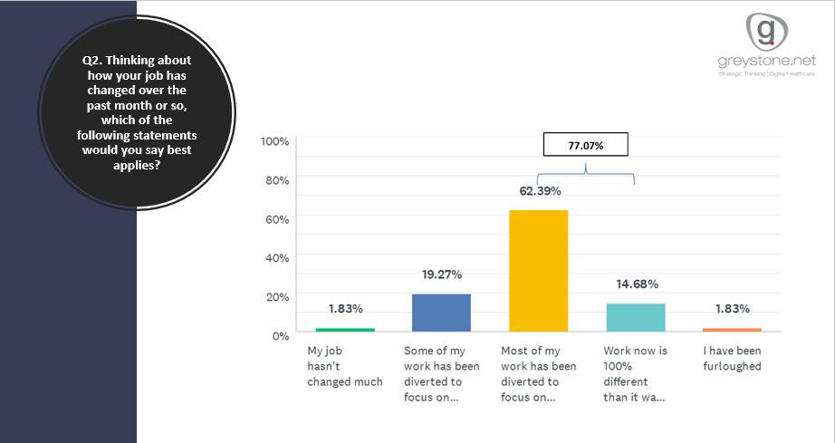 • Over three-fourths of healthcare marketers (77%) have noted a major change in their duties. Within this group, 62% said that “most” of their work had been diverted to COVID-related efforts and almost 15% said their work is 100% different than it was pre-COVID. part I survey slide 5