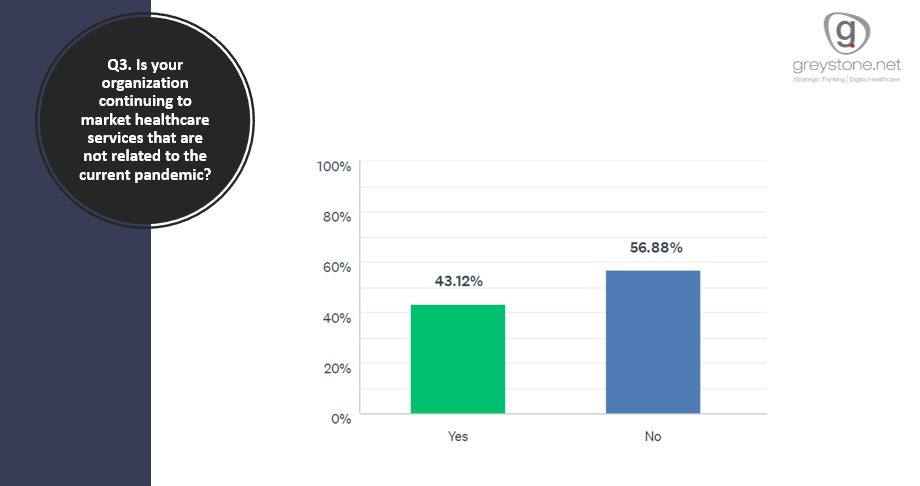 • More healthcare organizations than not have diverted their marketing efforts completely away from non-COVID-related content and services (57% to 43%).