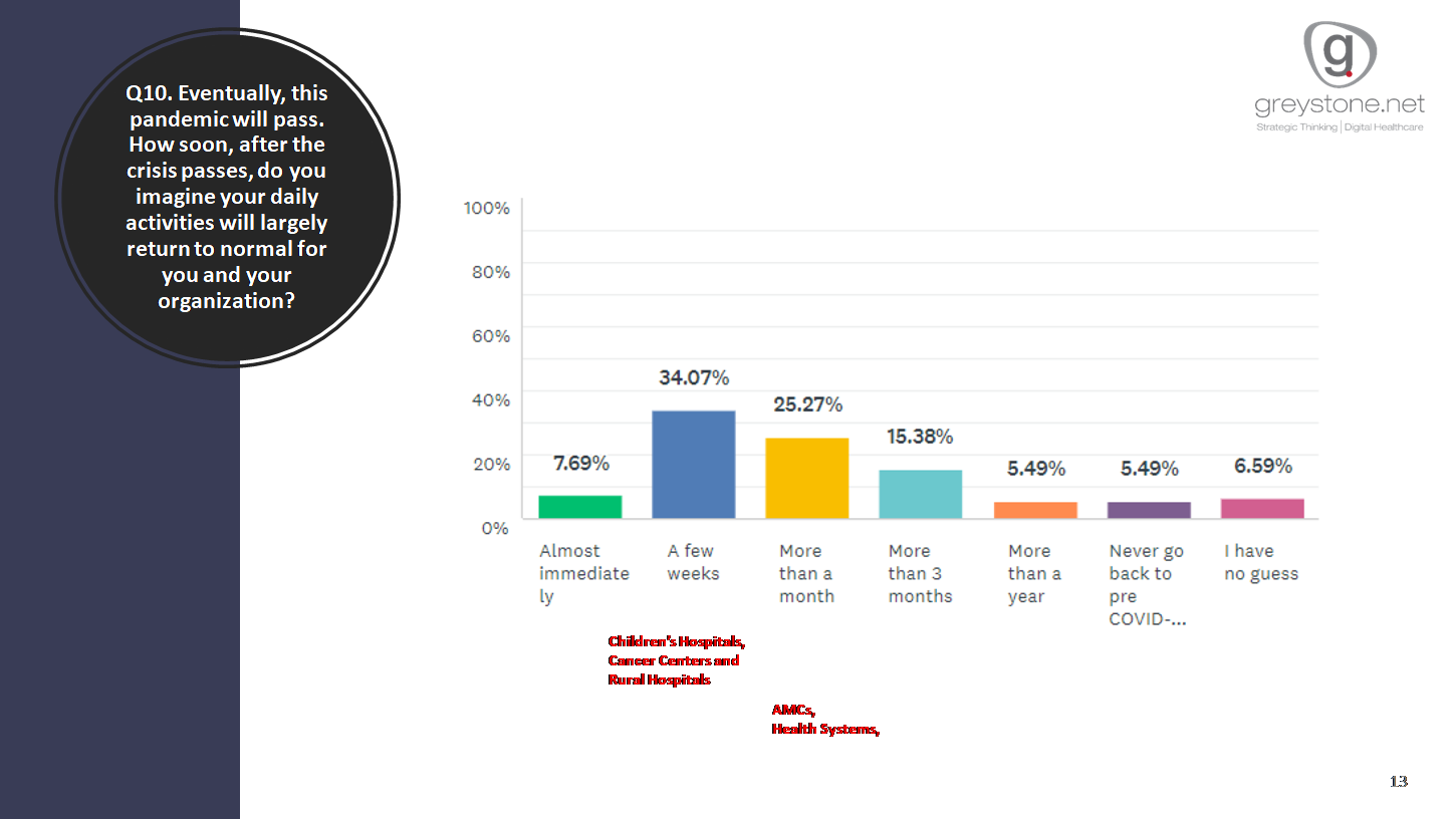 Respondents from children’s hospitals, cancer centers and rural hospitals tended to be more optimistic about the speed of a return to a pre-COVID status, while academic medical centers and health systems – regardless of size – predicted a slower return to “normal.”