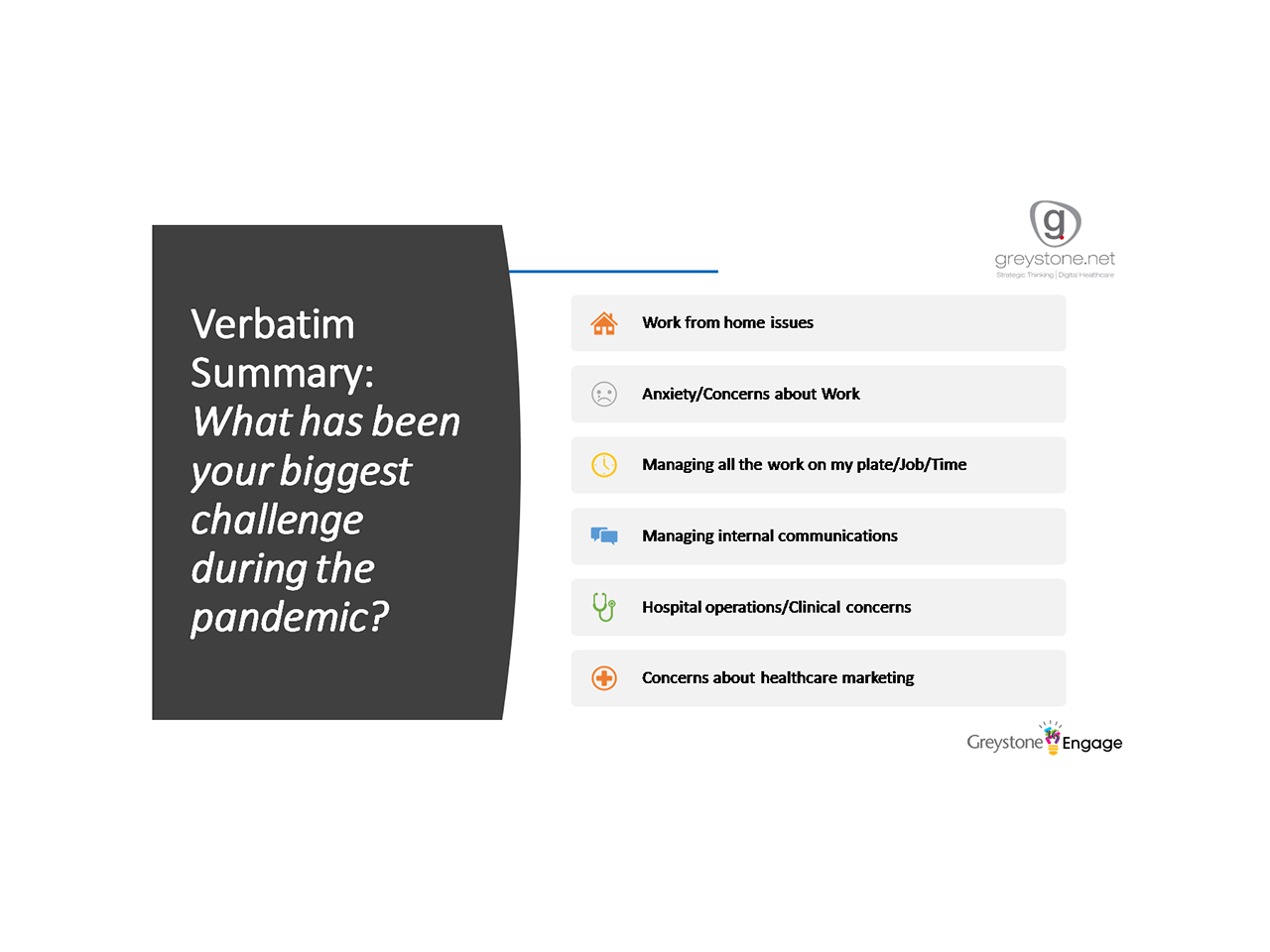 The survey was conducted as part of Greystone Engage, a membership group for healthcare professionals with responsibility for web development, web management, social media, digital marketing, data management, CRM, analytics, communications, public relations, market research, business development and other related areas. Engage provides an aggregate perspective of what’s going on in healthcare marketing across the country, across various types of provider settings.