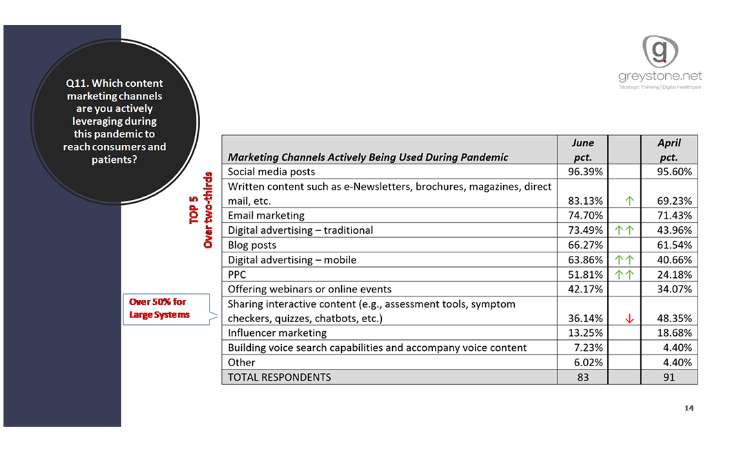 All of these channels saw an increase of some degree since April. In addition, mobile digital advertising and PPC saw significant increases – 40.66% up to 64.86% and 24.18% up to 51.81%, respectively. Over 50% of larger hospital systems are using interactive content (assessment tools, symptom checkers, quizzes, chatbots, etc.) but as a group, use of this channel is down from April. However, a lot of the interactive content deployed earlier in the pandemic was COVID-related, so that may explain the overall decrease in use.