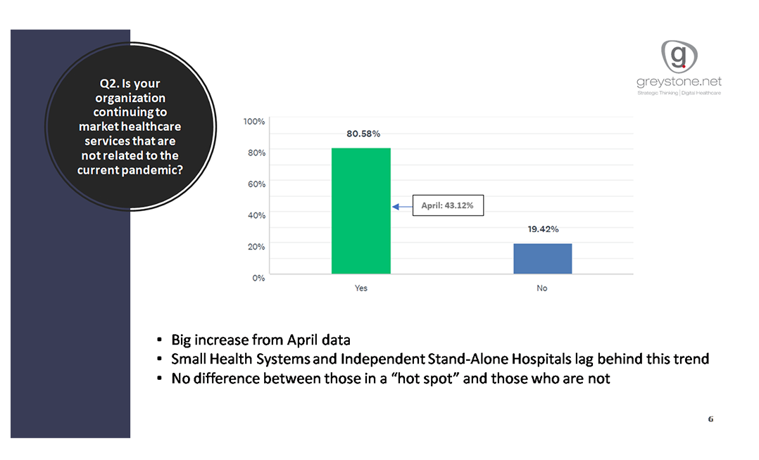 As might be expected, more organizations are marketing services not related to the pandemic than they were in April, up to 80% in May from 43% in April. The 80% was consistent between organizations located in a “hot spot” and those that were not. Small hospitals and stand-alone hospitals lag behind in this trend.