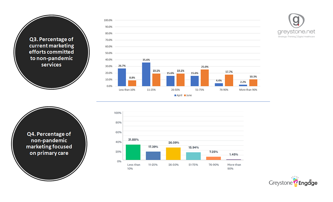 Conducted as part of Greystone Engage, Wave 2 of the survey was launched in June 2020. Results were compared to Wave 1 where appropriate. The survey respondents were 126 healthcare marketers from Greystone’s contact pool of provider organizations.